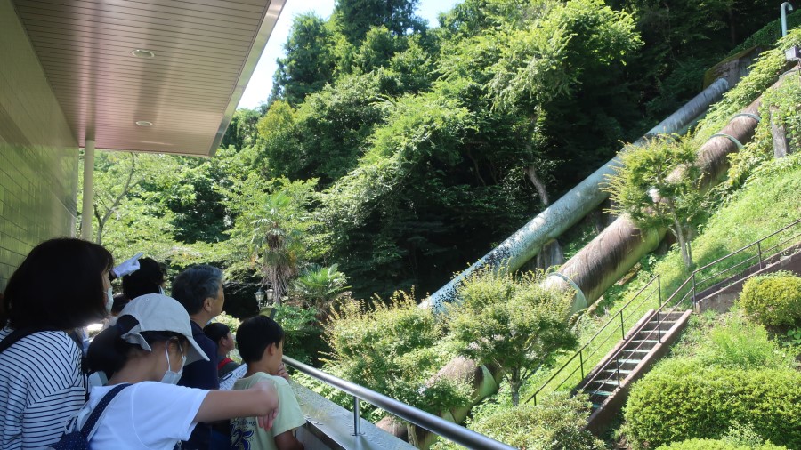 落差27m長さ45mの水圧鉄管の中を毎秒2.27立方メートルの水が流下しています。