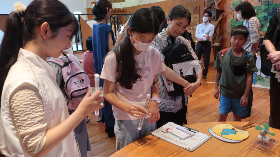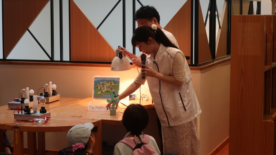 その他にも、ウチワの風で風車を回して電気をつくる風力発電の実験など、簡単に発電のしくみがわかる教材を使った体験実験を行いました。
