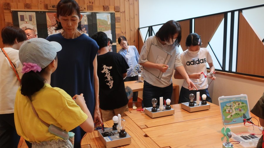 後半は「三居沢電気百年館」の2階にある「水と森のアトリエ」に移動して、教材を使った発電の実験に挑戦してみました。