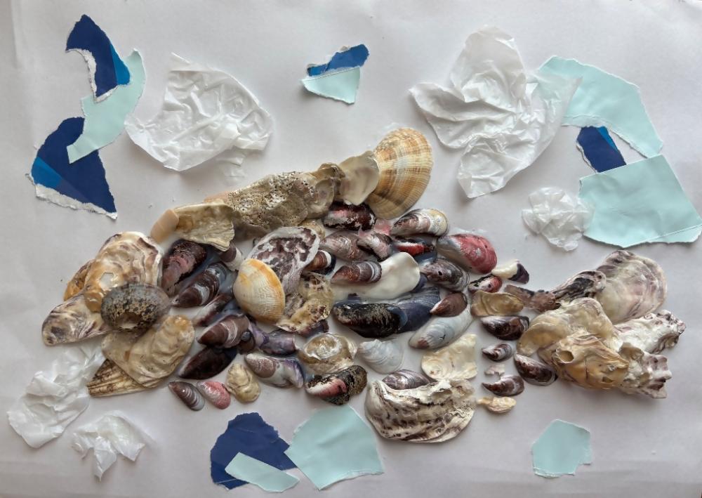 作品にこめた思い : 仙台の海岸でたくさんのきれいな貝殻を拾いました。その時にたくさんゴミが落ちていたので、ゴミのない海にしたいなと感じました。貝殻で作った綺麗な魚が、ビニール袋のゴミを食べている様子です。海岸のゴミ拾いを通じて、きれいな海を守りたいという思いを込めました。