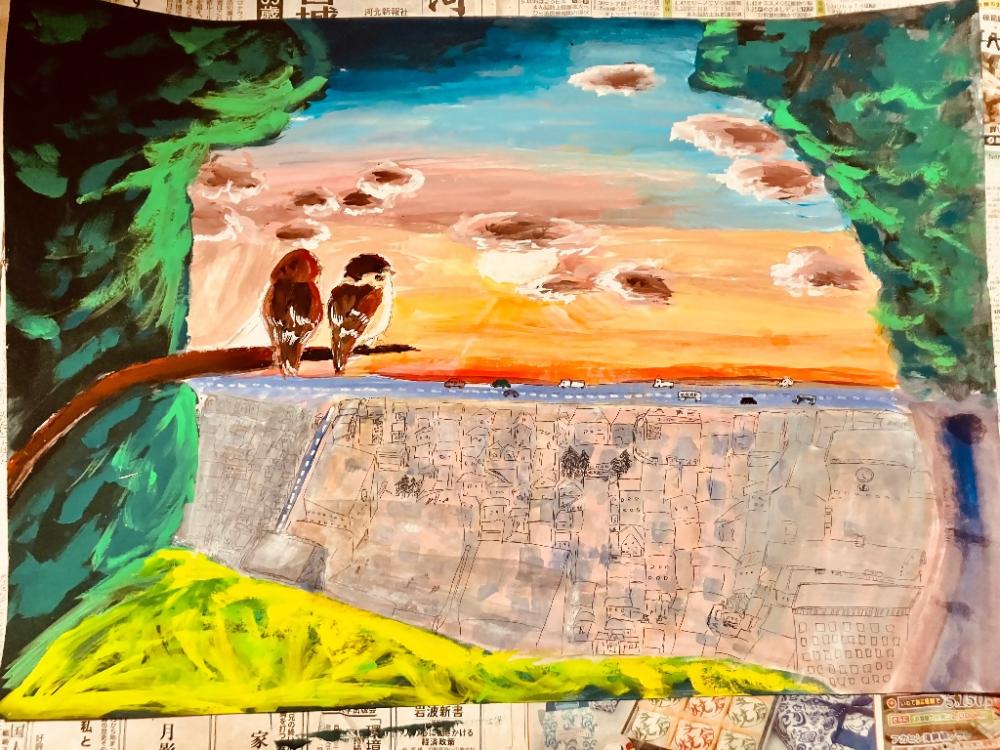 作品にこめた思い : 近頃、街が成長するにつれ、都市化が進んでいます。私達にはとても嬉しいことですが、動物にとっては居場所がなくなっていることそれにより巣が作れなくなり、絶滅しかけている動物達もいます。私は都市も自然も共に過ごせるような、環境が良い街が私の理想です。