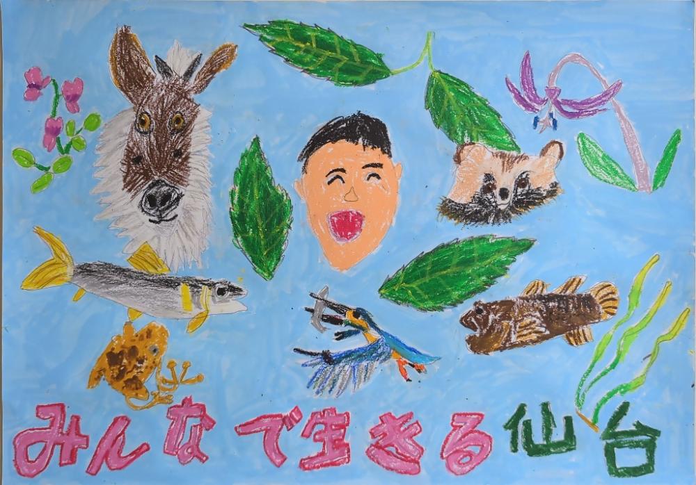 作品にこめた思い : 春に仙台に引越してきて、水族館や科学館や、山や川や公園や、色んなところに行きました。ぼくは特に海の生き物が好きでしたが、仙台は山から海まで色んな場所があって色んな生き物がいておもしろいです。この自然を守って、たくさんの生き物が生きられるといいなと思ってかきました。仙台の植物や生き物の色を見て、クレヨンを混ぜて模様を描くのを頑張りました。