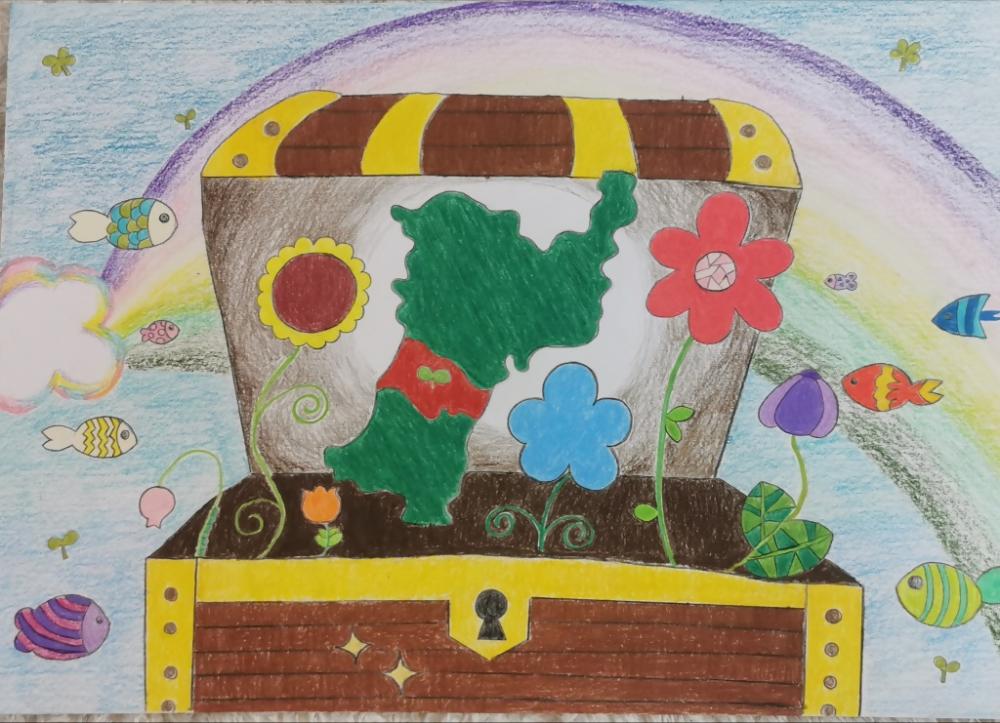 作品にこめた思い : 私は仙台がいつまでも彩り豊かな町でいてほしいと思っています。その願いをこめて、カラフルな花や魚に囲まれた仙台を描きました。いつまでも若葉が輝いていてほしいと思って、仙台に若葉も描いています。それを全部、宝箱につめました。大切に、カラフルな町を守っていきたいという気持ちです。