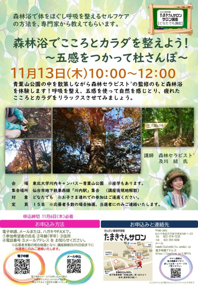 11/13(木)『森林浴でこころとカラダを整えよう! 〜五感をつかって杜さんぽ〜』のご案内