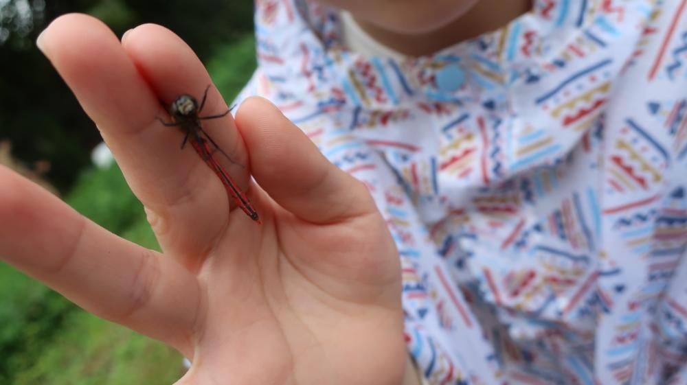 その後、貯水池に向かう途中でコオロギやバッタ、ツユムシ、トンボなど沢山の昆虫を発見!みんな虫取り網を使って捕獲するのに夢中です!