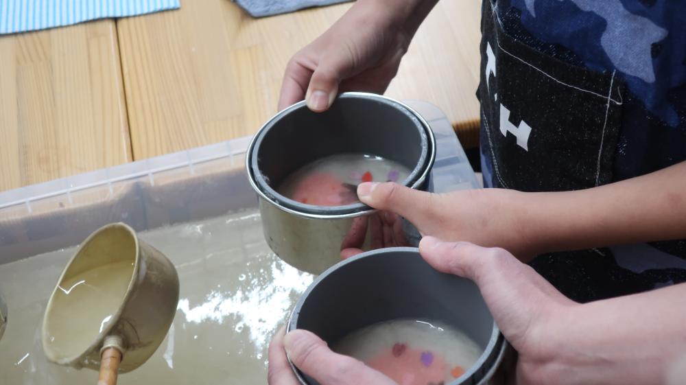 繊維を絡み合わせ、強く美しい和紙にするため、ぐるぐる回し、余分な水が切れるまで、振り動かします。