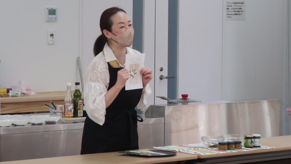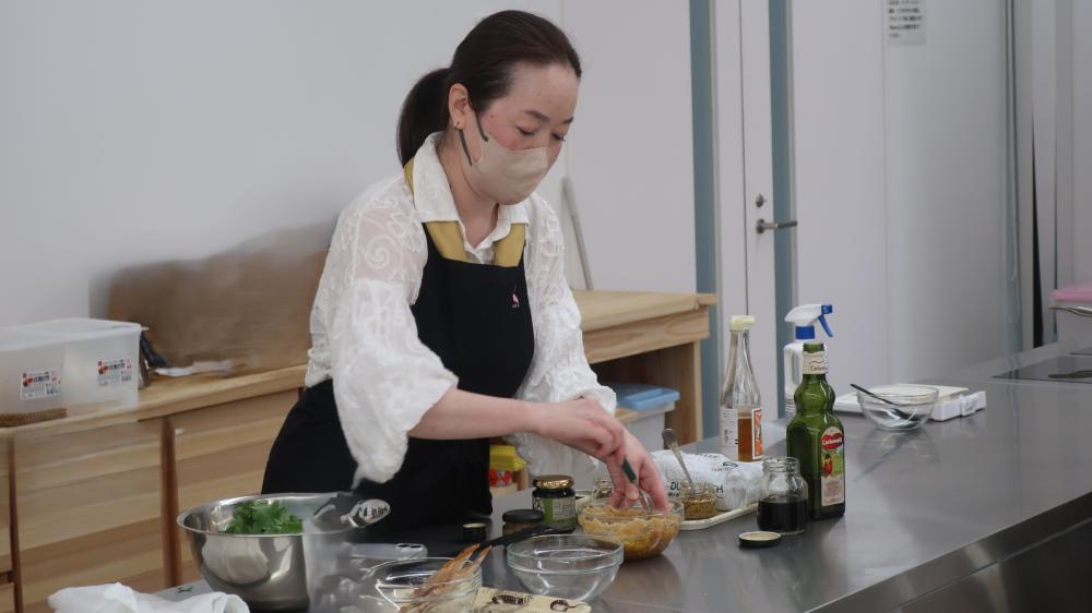 オリジナルマスタード作りの後は、心と体をあたためる旬の地元野菜のお話と、オリジナルマスタードを使ったリンゴマスタードドレッシングの調理実演と試食がありました。