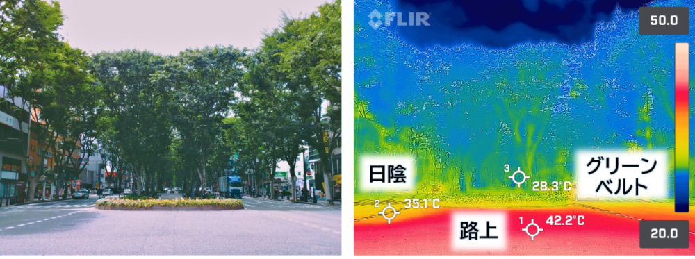 路面が42℃でもグリーンベルト内は28℃。木陰のおかげ、ですね。