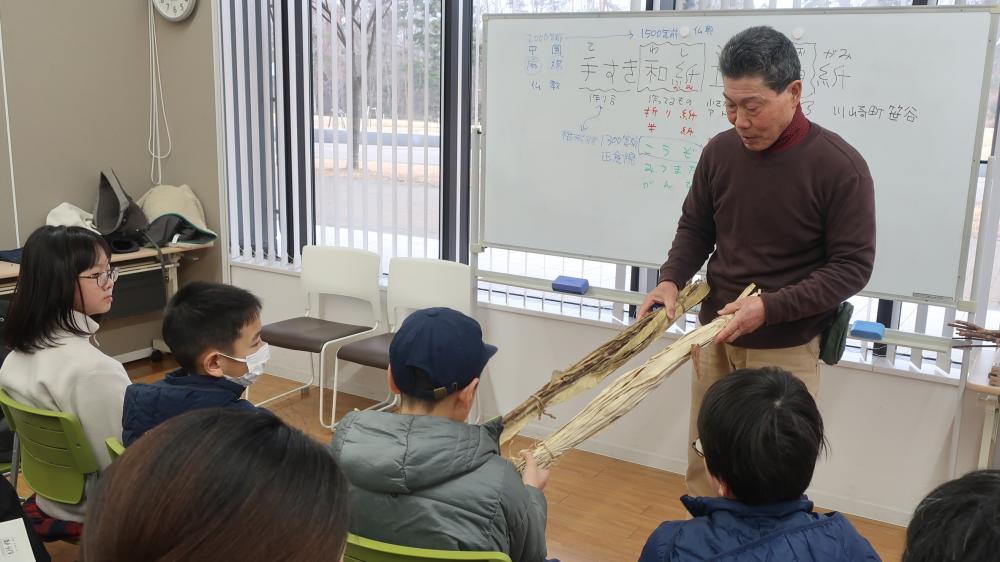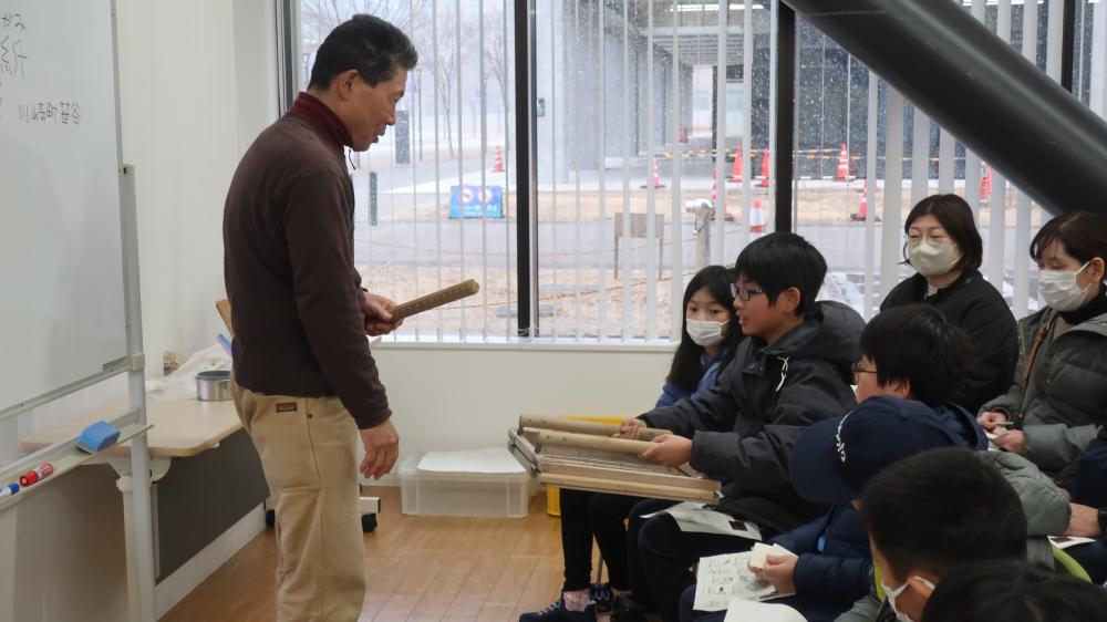 はじめに、塚原さんの工房がある川崎町内で自家栽培した楮(こうぞ)の木と皮や、紙すき道具に実際に触れながら、手すき和紙の歴史、材料や道具、洋紙との違いなどについて学びました。