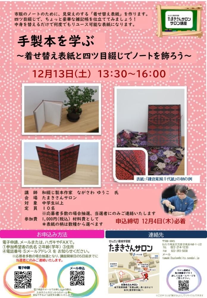 「手製本を学ぶ 〜着せ替え表紙と四ツ目綴じでノートを飾ろう〜」のご案内