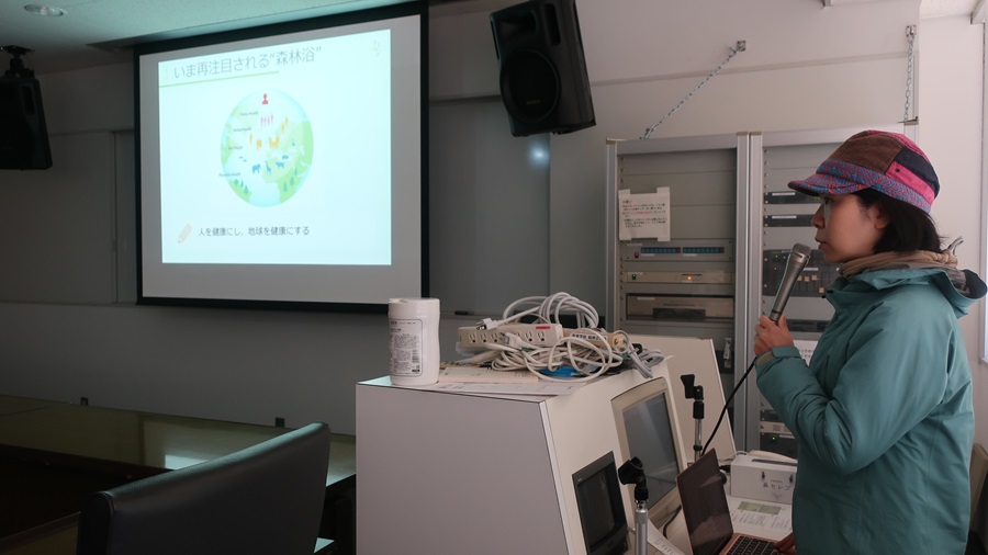 講座の最後に、大学の会議室を借りて、本日のまとめとして「森林浴」効果のエビデンスや森林浴の仕方について、講師から簡単な講義を受けました。