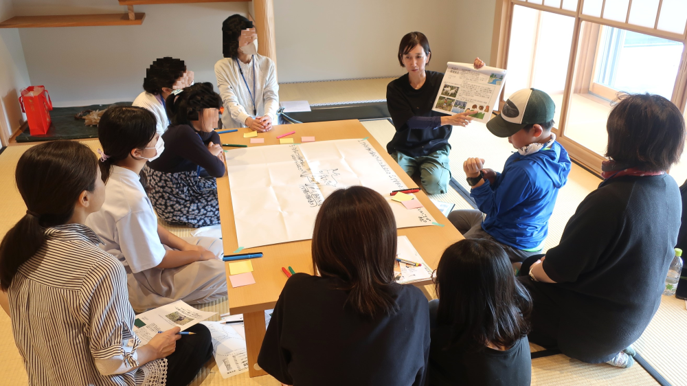 最後に、「ヤギの行動で一番驚いたこと」、「ヤギがいたことで、川・河原にどんないいことがある?」、「今日学んだことを家族や友人に伝えるとしたらどんなこと?」、「ヤギ除草の体験を通じて、自分たちにもできる身近な環境保全のアイディア」について、感想や意見をみんなでシェアしました。
